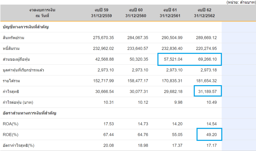 แต่เราจะเห็นว่าในเว็บไซต์ของ set นั้น ROE ของปี 62 ของหุ้นนี้ ได้เท่ากับ 49.2% เพราะในเว็บไซต์ของ set จะมีรายละเอียดอีกเล็กน้อยแบบนี้