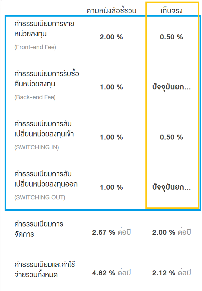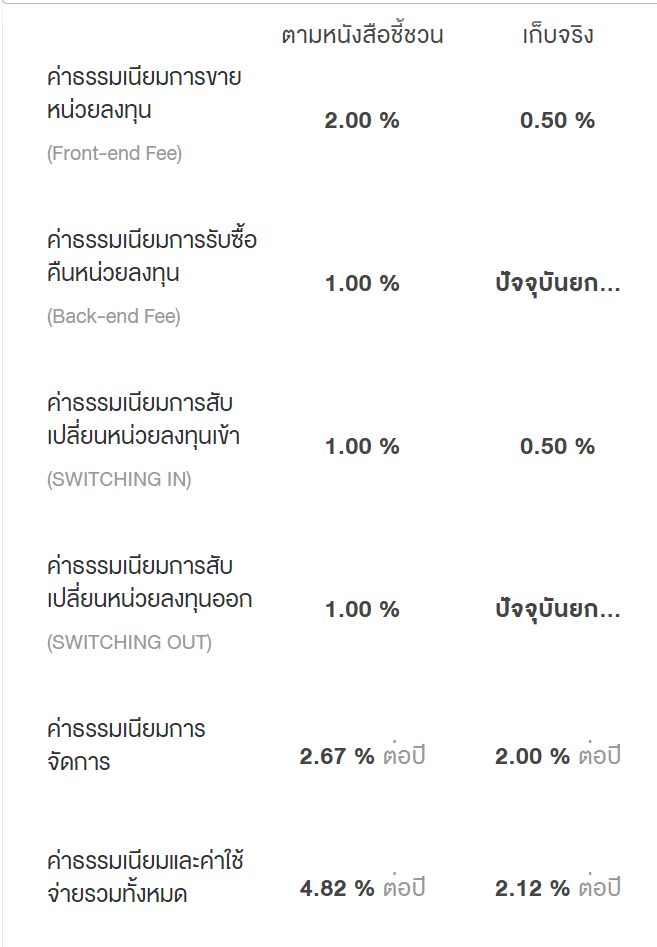 จากรูป ค่าใช้จ่ายในส่วนของ total expense ratio ที่ต้องจ่ายคือ 2.12% ต่อปี เราดูตามช่องที่เรียกเก็บจริง ซึ่งในจำนวนนี้ได้รวมค่าธรรมเนียมการจัดการที่เก็บจริงอยู่ตอนนี้ 2.00% ต่อปีนั้นไปด้วยแล้ว