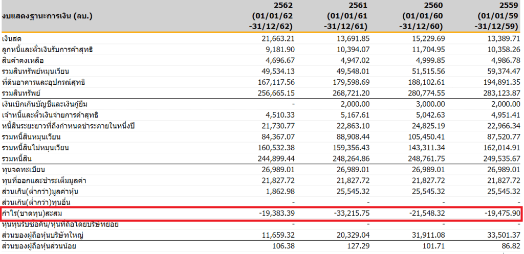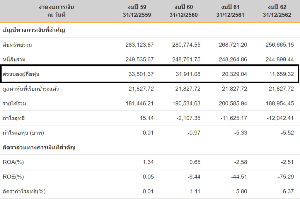 บริษัทนี้มีการขาดทุนเรื่อยๆ อาจมีบางปี ที่มีกำไรบ้าง และเมื่อสิ้นปี 2561 บริษัทมีขาดทุนสะสม ถึง 33,215 ลบ. กำไร(ขาดทุน)สะสมนั้น จะเป็นส่วนหนึ่งของ “ส่วนผู้ถือหุ้น”