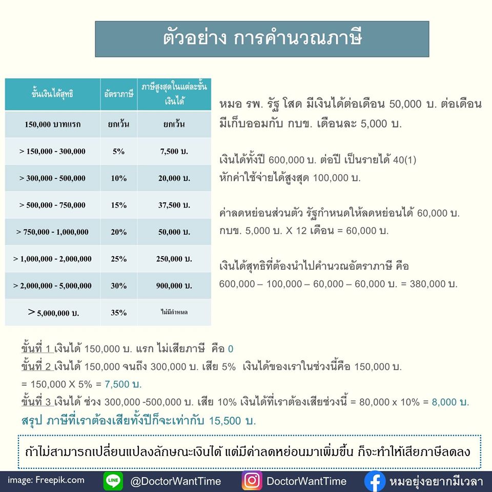จะได้เป็นรายได้สุทธิ = 420,000 บ. และนำรายได้ตรงนี้ไปเข้าเทียบกับ ตารางอัตราภาษี ทำให้ต้องเสียภาษีเป็น
