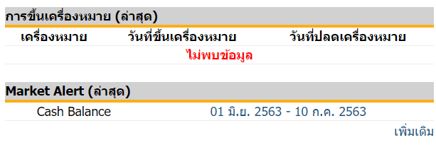 ซึ่งเราสามารถเข้าไปหาข้อมูลได้ว่า หุ้นนั้นมีการขึ้นเครื่องหมายแจ้งเตือนอะไรบ้าง ตั้งแต่เมื่อไหร่ และจะถึงเมื่อไหร่ สามารถเข้าไปดูได้ที่เว็บไซต์ของ set และเข้าไปตรงหุ้นที่เราสนใจ กดเลือก สรุปข้อสนเทศบริษัทจดทะเบียน และเลื่อนลงมาด้านล่างๆ ของหน้า จะมีข้อมูล การขึ้นเครื่องหมาย(ล่าสุด) และ Market Alert(ล่าสุด) แบบนี้