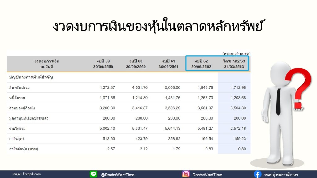 – จากงบตัวอย่างที่แสดงในรูปจะเห็นงบที่แสดงล่าสุด เป็น 2/63 (31/3/63) จะเป็นงบรอบ 6 เดือน ตั้งแต่ 1 ตุลาคม 62 ถึง 31 มีนาคม 63 เพราะตารางงบที่แสดงทั้งในตารางงบย่อ และในสรุปข้อสนเทศบริษัทจดทะเบียนจะแสดงเป็นงบรวมของทั้ง 2 ไตรมาส แต่ถ้าเราต้องการดูแค่ไตรมาส 2 คือช่วงเดือน มกราคม 63 ถึง มีนาคม 63 ต้องเข้าไปดูในงบการเงินฉบับเต็มที่เป็นไฟล์ Excel ซึ่งเขาจะมีแสดงไว้ในแต่ละไตรมาส
