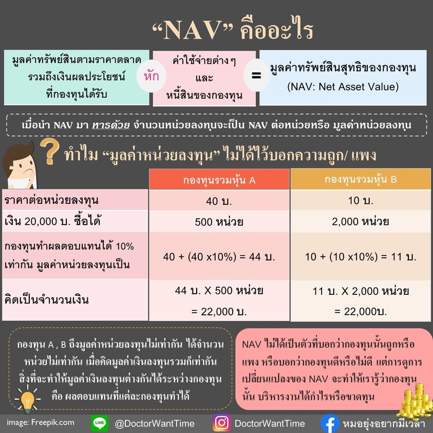 NAV (Net Asset Value) หรือ ทรัพย์สินสุทธิของกองทุน คิดมาจากมูลค่าทรัพย์สินของกองทุน รวมถึงเงินผลประโยชน์ต่างๆ ที่กองทุนได้รับ หักด้วยค่าใช้จ่ายและหนี้สินของกองทุน ก็ได้ออกมาเป็นทรัพย์สินสุทธิของกอง และถ้านำ NAV มาหารด้วย จำนวนหน่วยลงทุน ก็จะเป็น NAV ต่อหน่วย