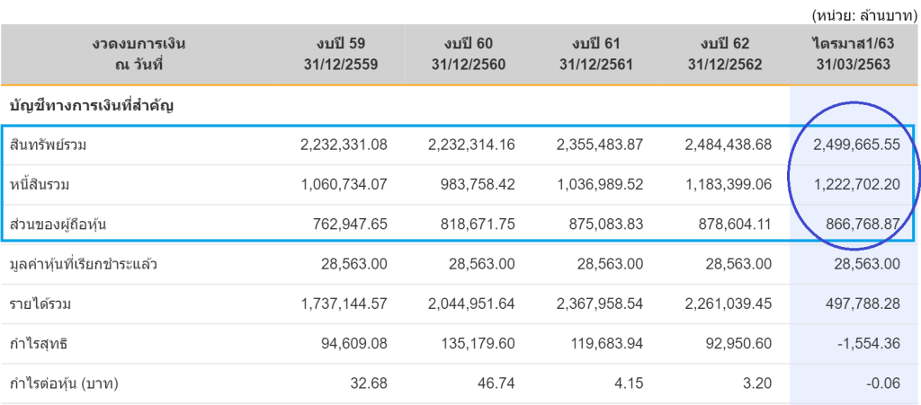 ในตาราง “งบการเงิน/ ผลประกอบการ” ของหุ้นที่เราสนใจในเว็บไซต์ของ set นั้น เมื่อเราดูงบดุลของหุ้น PTT เราจะเห็นแบบนี้…