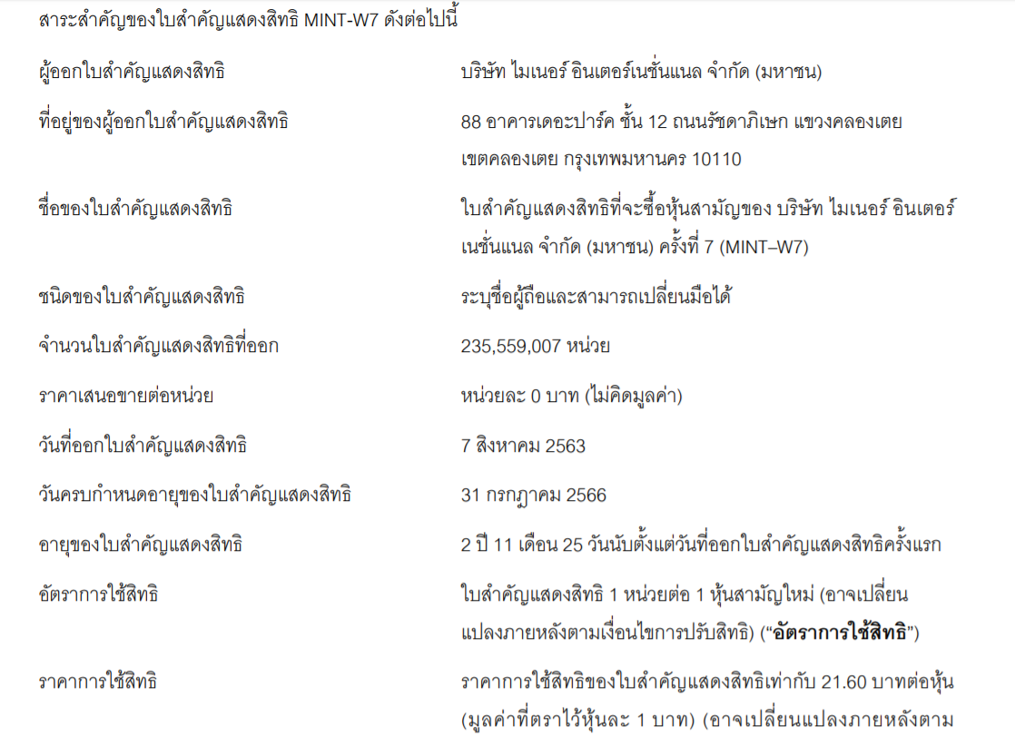 อย่าง MINT-W7 ก็แจกให้ฟรีกับผู้ถือหุ้นเดิม ตามสัดส่วนที่บริษัทที่ออกกำหนดไว้