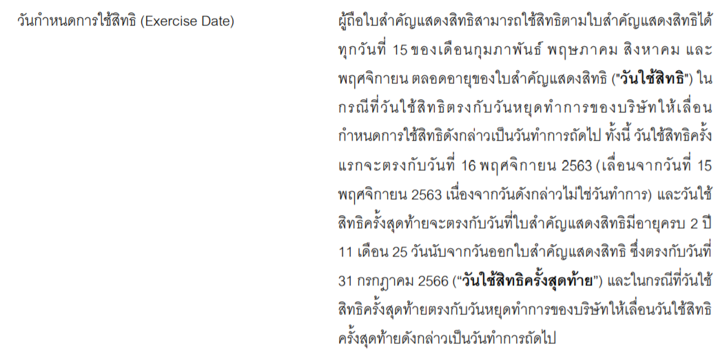 ใช้สิทธิครั้งแรกได้ 16 พฤศจิกายน 2563 และจะเปิดโอกาสให้แลกได้ ทุกวันที่ 15ของเดือนกุมภาพันธ์ พฤษภาคม สิงหาคม และ พฤศจิกายน และวันใช้สิทธิครั้งสุดท้ายจะตรงกับวันที่ใบสําคัญแสดงสิทธิมีอายุครบ 2 ปี 11 เดือน 25 วันซึ่งตรงกับวันที่ 31 กรกฎาคม 2566 (บริษัทกำหนดไว้ว่า MINT-W7 จะหมดอายุวันที่ 31 กรกฎาคม 2566 นะ)