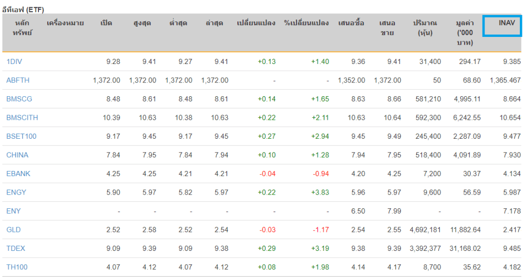 ถ้าจะดูค่า INAV ในเว็บไซต์ของ set สามารถเข้าไปที่หน้าข้อมูล ETF และเลือกหัวข้อ “ราคา ETF” จะเห็นค่า INAV