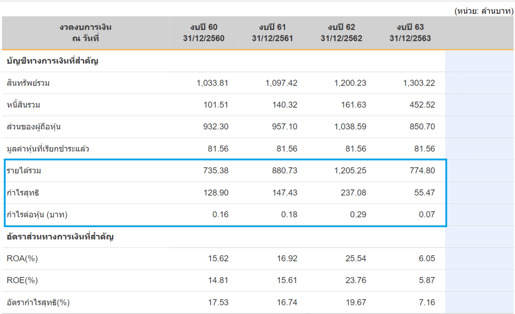 3 บรรทัดถัดมา คือ งบกำไรขาดทุน ซึ่งในตารางงบย่อ จะแสดง รายได้รวม กำไรสุทธิ และกำไรต่อหุ้น