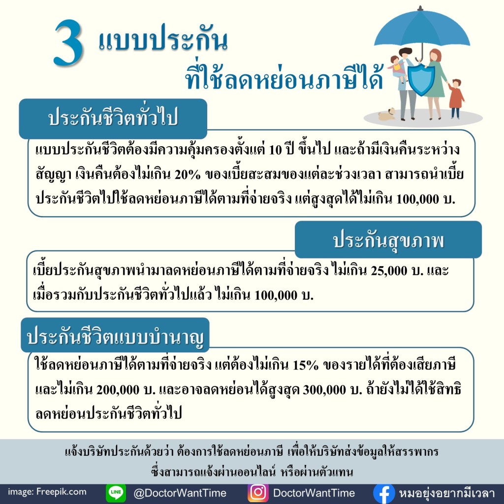 เบี้ยประกันที่สามารถนำมาลดหย่อนภาษีได้จะมี 3 แบบ คือ ประกันชีวิตทั่วไป ประกันสุขภาพ และประกันชีวิตแบบบำนาญ ซึ่งทั้ง 3 แบบนี้สามารถนำเบี้ยประกันที่เราจ่ายไป มาลดหย่อนภาษีได้ แบบนี้…