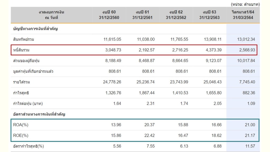 หุ้นตัวอย่างจะเห็นว่า หนี้สินมาก เมื่อเทียบกับส่วนผู้ถือหุ้น ซึ่งเราจะเห็นว่า ROE ต่างจาก ROA มาก