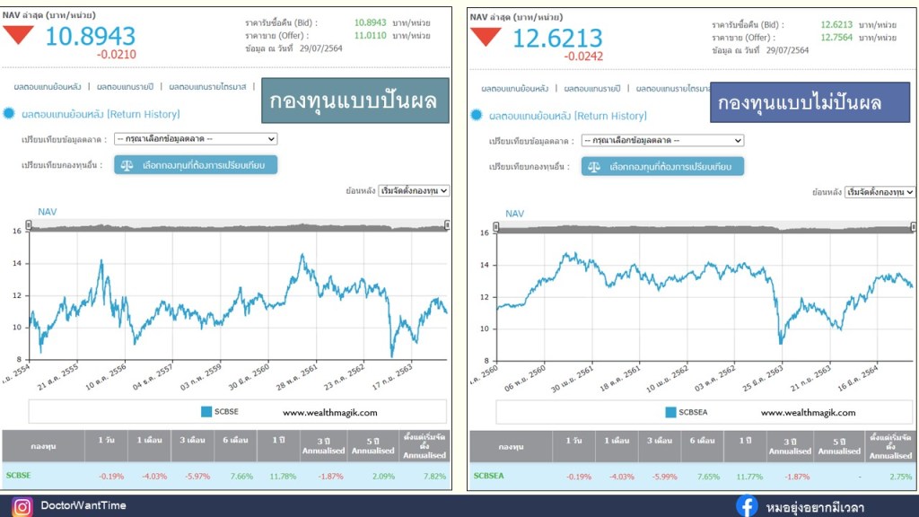 ลองดูกอทุนรวมหุ้น 2 กองในรูปด้านล่าง ซึ่งเป็นกองแบบเดียวกัน ต่างแค่กองหนึ่งปันผล อีกกองไม่ปันผล ในตัวอย่างนั้น กองทุนแบบปันผลจัดตั้งก่อนตั้งแต่ปี 54 ส่วนกองทุนไม่ปันผลนั้น เริ่มเมื่อนปี 60 จะเห็นว่าผลตอบแทนไม่ได้ต่างกัน โดยอยู่บนพื้นฐานที่ว่า เงินปันผลที่ได้ออกมา ถูกนำไป re-invest