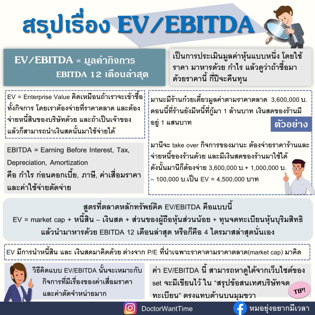 EV/EBITDA = ราคาถ้าเราจะ take over กิจการทั้งหมด / กำไรที่เป็น EBITDA ทั้งปี