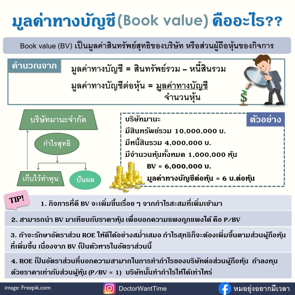 ถ้าซื้อที่ P/BV น้อยกว่า 1 เท่า แสดงว่า เราจ่ายเงินเพื่อเป็นเจ้าของหุ้นตัวนั้นถูกกว่าส่วนของเจ้าของ - Book value นั้นจะเป็นตัวหารในการคิดอัตราส่วนที่สำคัญของ ROE (return on equity) คิดโดย กำไรสุทธิ หารด้วย ส่วนผู้ถือหุ้น ซึ่งถ้าจะรักษาอัตราส่วน ROE ให้ดีได้อย่างสม่ำเสมอ กำไรสุทธิก็จะต้องเพิ่มขึ้นตามส่วนผู้ถือหุ้นที่เพิ่มขึ้น