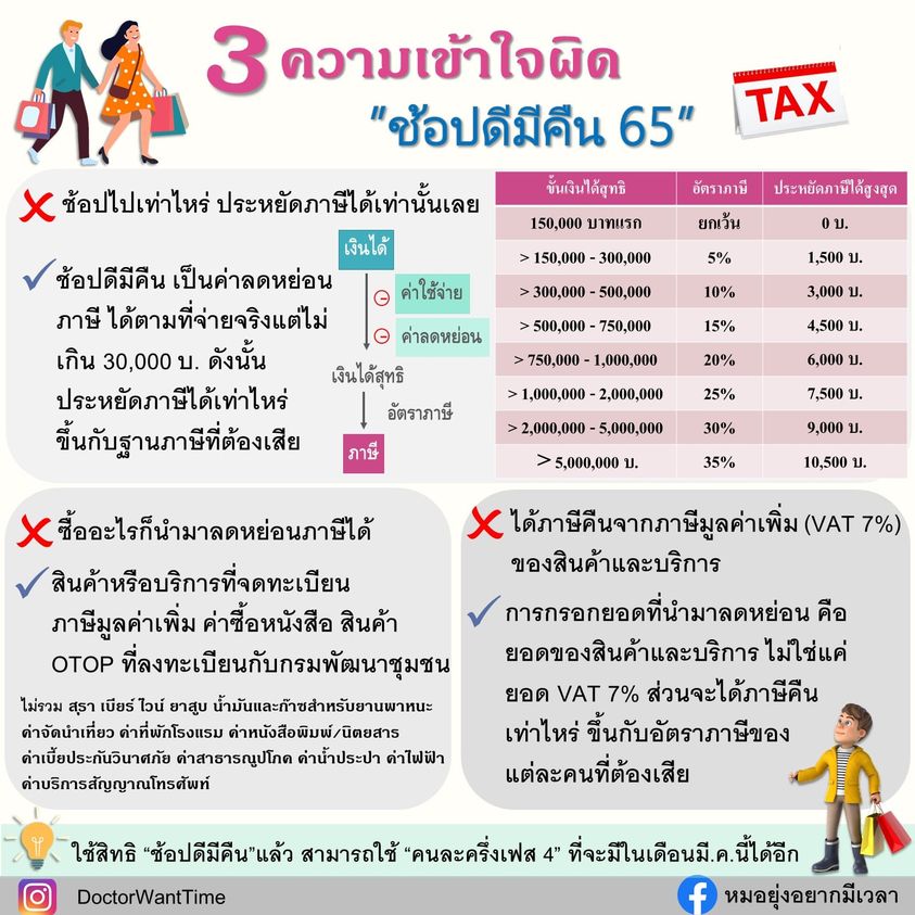 ข้อเน้นว่าสำหรับปีภาษี 65 นะ และควรเก็บหลักฐานใบกำกับภาษีเต็มรูปแบบไว้ให้ดี เพราะกว่าจะยื่นภาษีคือ ตอนต้นปี 66 และมาตรการนี้ใช้เป็นค่าลดหย่อน (ไม่ใช่นำไปหักจากภาษีที่เราต้องเสียโดยตรง) ดังนั้นจะประหยัดภาษีไปได้มากน้อยขึ้นกับฐานภาษีที่แต่ละคนต้องเสียนะ