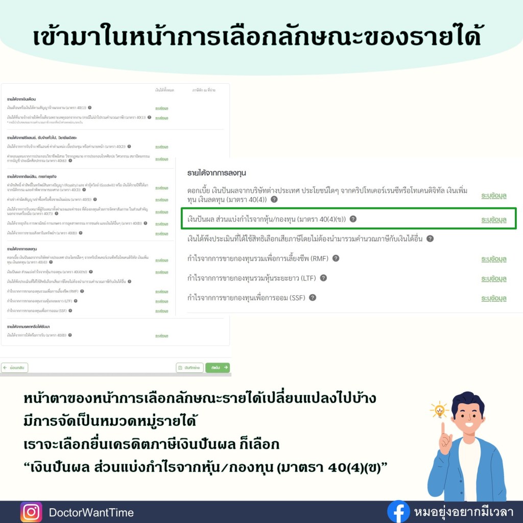 เราจะเลือกยื่นเครดิตภาษีเงินปันผล ก็เลือก “เงินปันผล ส่วนแบ่งกำไรจากหุ้น/กองทุน (มาตรา 40(4)(ข)”