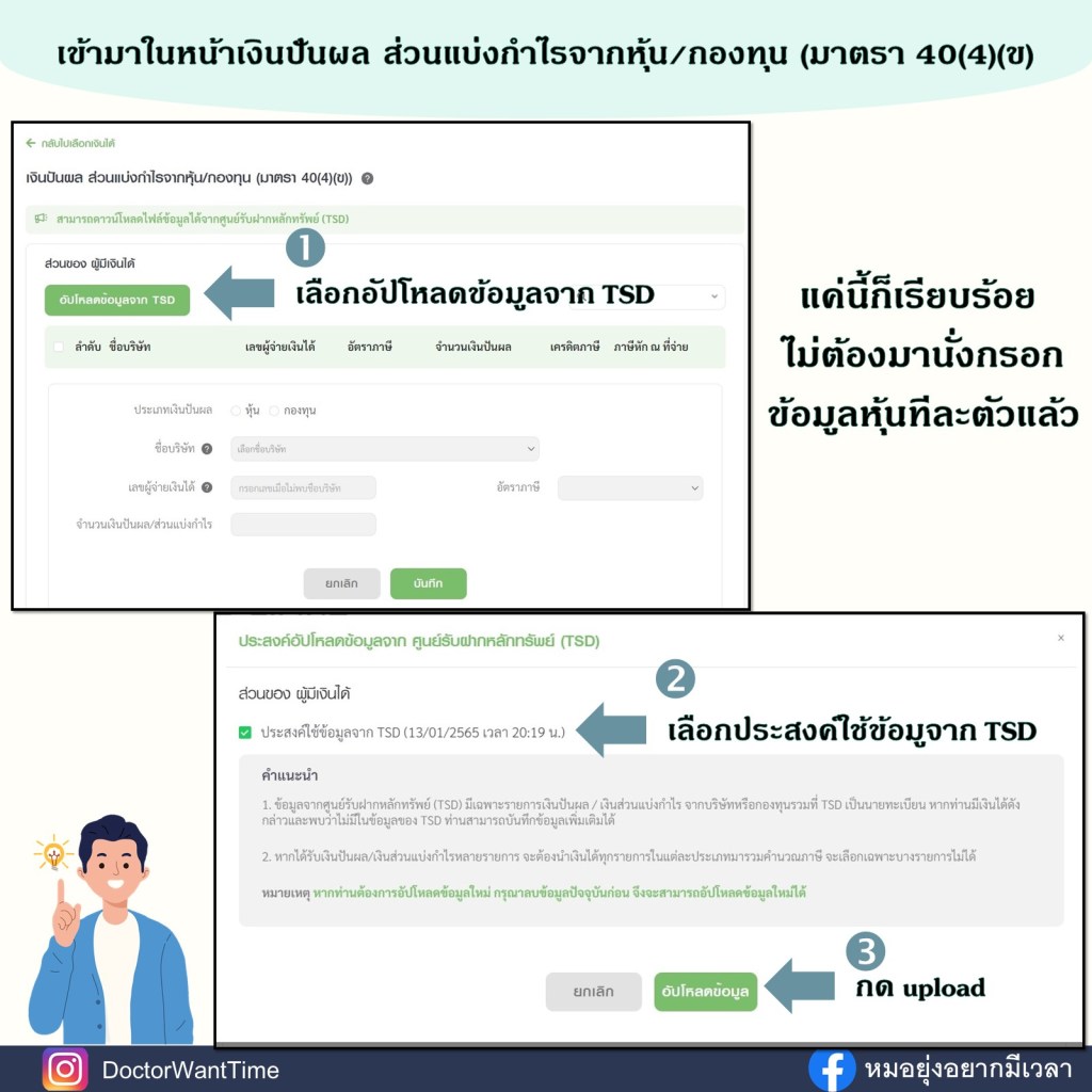 เมื่อเข้ามาในหน้าเงินปันผล ส่วนแบ่งกำไรจากหุ้น/กองทุน (มาตรา 40(4)(ข) แล้วเลือก เลือกอัปโหลดข้อมูลจาก TSD