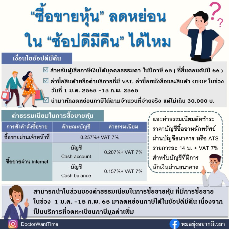 สรุป!! สามารถนำเฉพาะในส่วนของค่าธรรมเนียมในการซื้อขายหุ้น ที่มีการซื้อขายในช่วง 1 ม.ค. -15 ก.พ. 65 มาลดหย่อนภาษีได้ในช้อปดีมีคืน เนื่องจากเป็นบริการที่จดทะเบียนภาษีมูลค่าเพิ่มนะ ส่วนหลักฐานเพื่อยื่นสรรพากร ก็ต้องเก็บใบกำกับภาษีที่เราซื้อขายหุ้นจากโบรกเกอร์ไว้ด้วยนะ ปกติเขาจะส่งให้ทุกครั้งที่มีการซื้อขายอยู่แล้ว