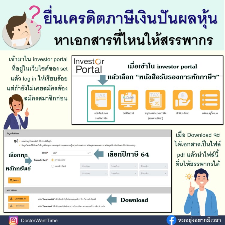 ถ้าเราสมัคร TSD investor portal อยู่แล้ว เราสามารถเข้าไปโหลดเอกสารรับรองการหักภาษีเพื่อยื่นเอกสารเพิ่มเติมให้สรรพากร โดยเมื่อ log in ใน investor portal แล้ว ให้เลือกหัวข้อ “หนังสือรับรองการหักภาษีฯ” เลือกปีภาษี “2564” ถ้าเราต้องการทั้งหมดในปีภาษีนี้ ก็เลือก “ทุกหลักทรัพย์” แล้วกด “download all” แต่ถ้าเราทำหายที่เขาส่งมาแค่บางอันก็สามารถเลือกแต่ละตัวแล้วเลือก “download” เป็นอันๆ ไปก็ได้