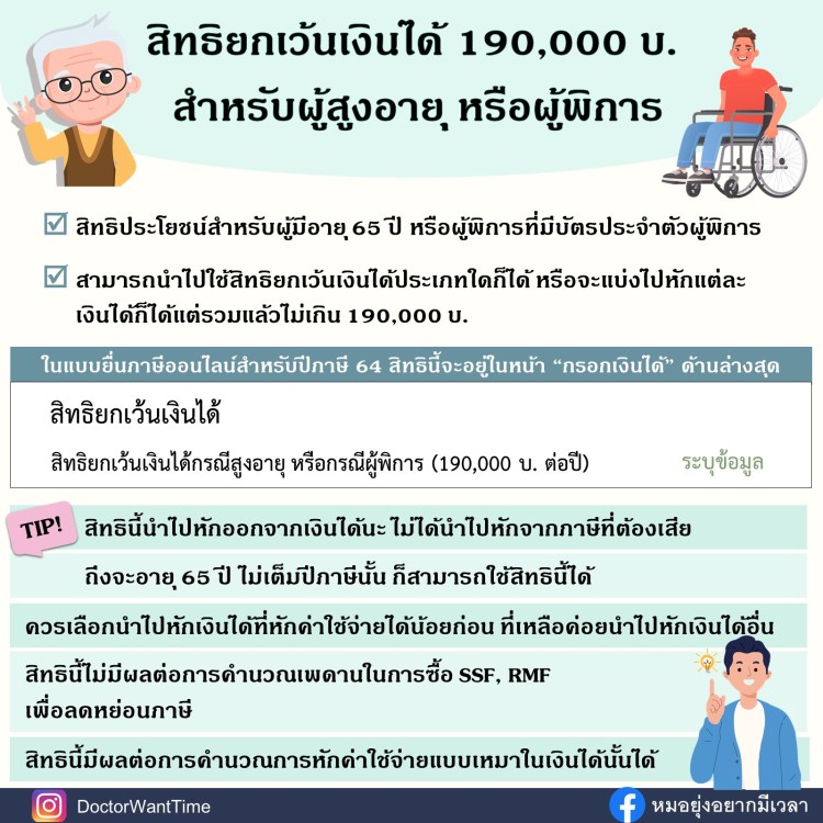 ถ้าใครมีผู้สูงอายุที่อายุตั้งแต่ 65 ปีขึ้นไป หรือผู้พิการที่มีบัตรผู้พิการ อย่าลืมให้เขาใช้สิทธิตรงนี้นะ เพราะระบบยื่นภาษีจะไม่ได้หักให้อัตโนมัติ จะได้ไม่ต้องเสียภาษีเกินที่ควรต้องเสีย