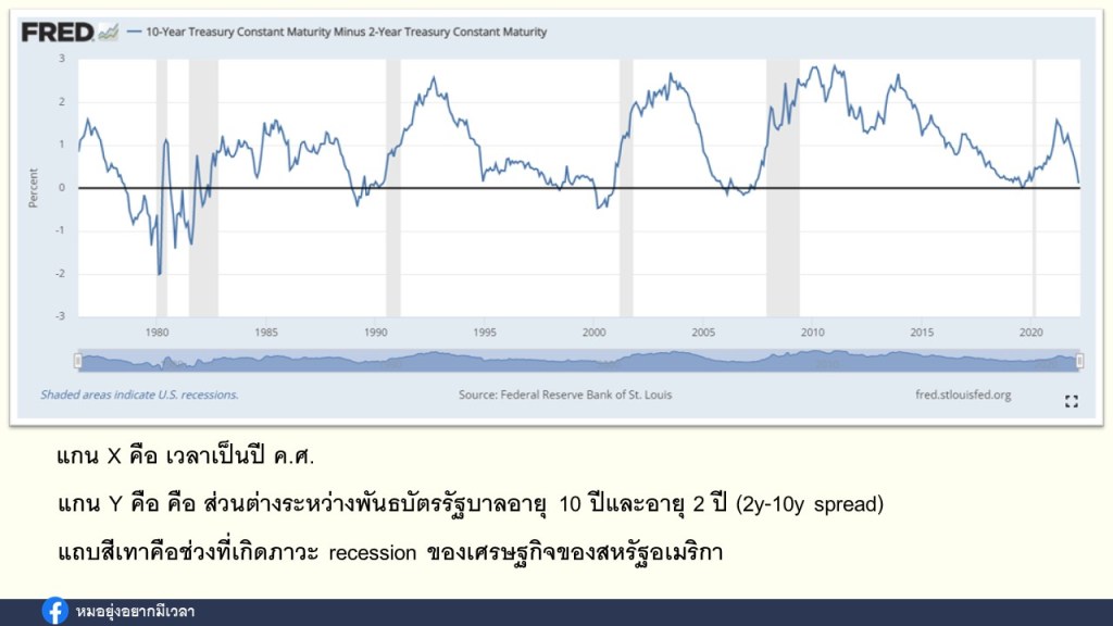 การเกิด Inverted Yield Curve เหมือนเป็น market indicator ว่าอาจมีโอกาสที่เศรษฐกิจถดถอยตามมาได้ ซึ่งตอนนี้ส่วนต่างระหว่างพันธบัตรรัฐบาลอายุ 10 ปีและอายุ 2 ปี (2y-10y spread) ของอเมริกาเริ่มลดลงมาอยู่ที่ 0.11% ยังไม่ได้ถึงขนาดติดลบ