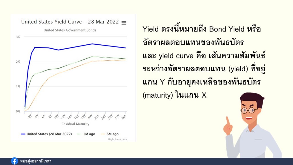 ปกติแล้ว Bond Yield หรืออัตราผลตอบแทนของพันธบัตรนั้น อัตราผลตอบแทนพันธบัตรระยะยาวมักจะ “สูงกว่า” พันธบัตรระยะสั้น เพราะว่า พันธบัตรระยะยาวมีความเสี่ยงจากที่ราคาจะผันผวนได้มากกว่าพันธบัตรอายุสั้น เนื่องจากความไม่แน่นอนของทิศทางอัตราดอกเบี้ยในอนาคต เรื่องความกังวลต่ออัตราเงินเฟ้อ
