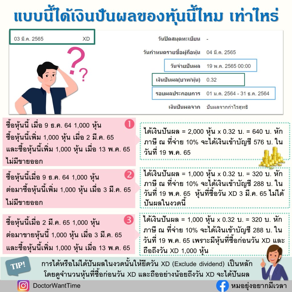 แบบนี้ได้เงินปันผล = 1,000 หุ้น x 0.32 บ. = 320 บ. หักภาษี ณ ที่จ่าย 10% จะได้เงินเข้าบัญชี 288 บ. ในวันที่ 19 พ.ค. 65 หุ้นที่ซื้อวัน XD 3 มี.ค. 65 ไม่ได้ปันผลในงวดนี้