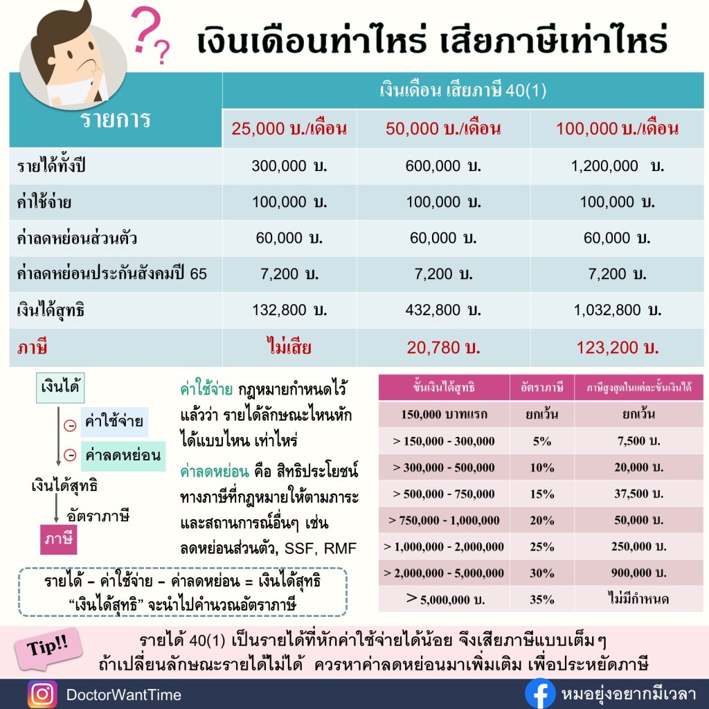 เงินได้ทั้งปี 50,000 บ. X 12 เดือน = 600,000 บ. ต่อปี เป็นรายได้ 40(1)