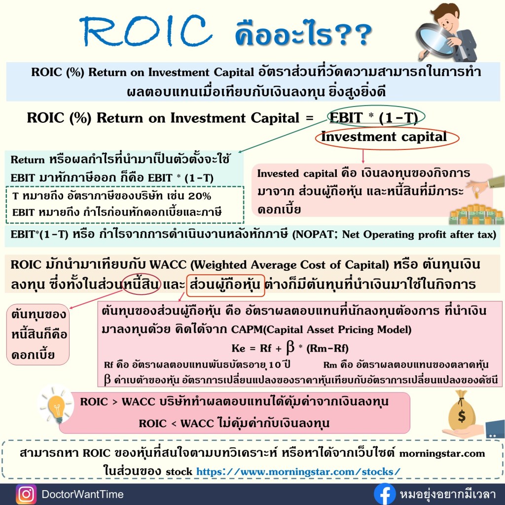 ROIC มาปรับข้อด้อยของ ROA และ ROE เพื่อแสดงถึงผลตอบแทนของเงินลงทุน แต่ไม่มีแสดงในเว็บไซต์ของ set ดังนั้นอาจคิดเอง หรือเข้าไปหาดูจากในเว็บไซต์ของ morningstar หรือตามบทวิเคราะห์