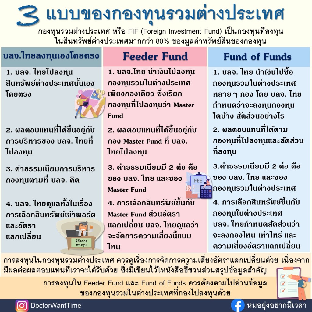 2. แบบที่ บลจ.ไทยไปซื้อกองทุนรวมที่บริหารโดยต่างประเทศอีกทอดหนึ่ง ซึ่งตรงนี้จะแบ่งอีก 2 ลักษณะย่อย ที่เราเรียกว่า Feeder Fund และ Fund of Funds