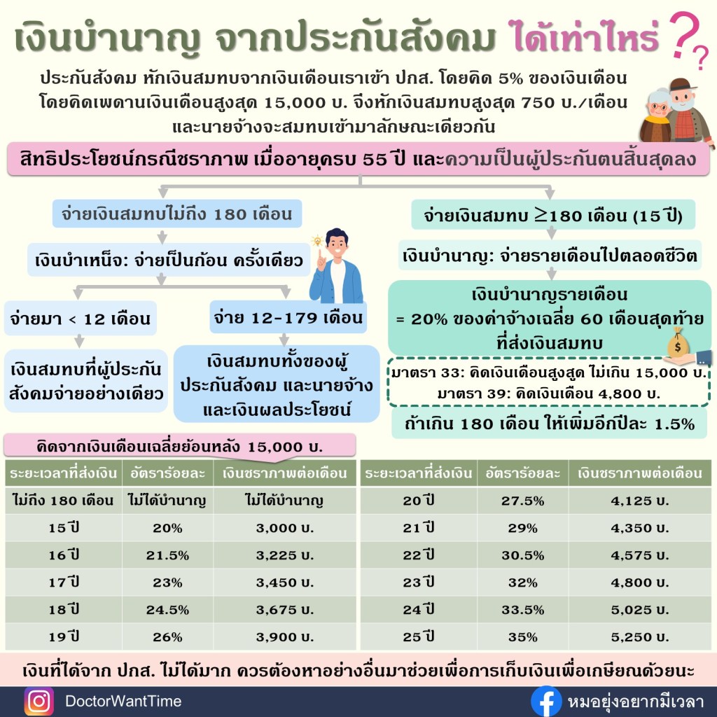 หนึ่งในสิทธิประโยชน์ที่เราได้รับ คือ กรณีชราภาพ ซึ่งจะได้เมื่ออายุครบ 55 ปี และความเป็นผู้ประกันตนสิ้นสุดลง ส่วนจะได้เป็นบำนาญ หรือบำเหน็จขึ้นกับจำนวนเดือนที่เราหักเงินเข้าประกันสังคม ตัดที่ 180 เดือน ลองอ่านในภาพประกอบนะจะได้เข้าใจมากขึ้น