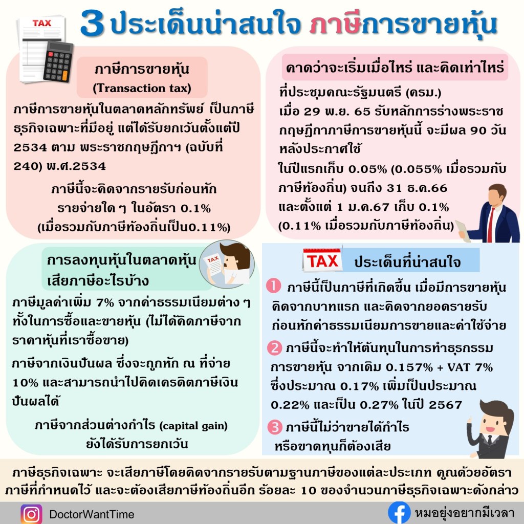 2. ภาษีนี้จะทำให้ต้นทุนในการทำธุรกรรมการขายหุ้น จากเดิม 0.157% + VAT 7% ซึ่งประมาณ 0.168% เพิ่มเป็นประมาณ 0.22% และเป็น 0.28% ในปี 2567