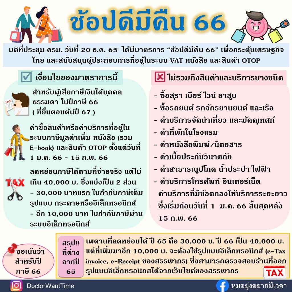 เพดานที่ลดหย่อนได้ ปี 65 คือ 30,000 บ. ปี 66 เป็น 40,000 บ. แต่ที่เพิ่มมาอีก 10,000 บ. จะต้องใช้รูปแบบอิเล็กทรอนิกส์ (e-Tax invoice, e-Receipt ของสรรพากร) ซึ่งสามารถตรวจสอบร้านที่ออกรูปแบบอิเล็กทรอนิกสได้จากเว็บไซต์ของสรรพากร https://etax.rd.go.th/etax_staticpage/app/#/index/registered#top