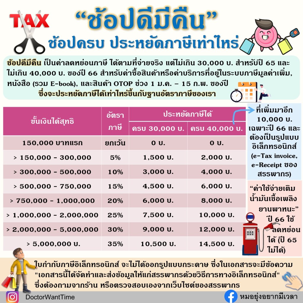 ช้อปดีมีคืน เป็นค่าลดหย่อนภาษีสำหรับภาษีเงินได้บุคคลธรรมดา ได้ตามที่จ่ายจริง แต่ไม่เกิน 30,000 บ. สำหรับปี 65 และไม่เกิน 40,000 บ. ของปี 66 สำหรับค่าซื้อสินค้าหรือค่าบริการที่อยู่ในระบบภาษีมูลค่าเพิ่ม, หนังสือ (รวม E-book), และสินค้า OTOP ช่วง 1 ม.ค. – 15 ก.พ. ของปี ซึ่งจะประหยัดภาษีได้เท่าไหร่ขึ้นกับฐานอัตราภาษีของเรา