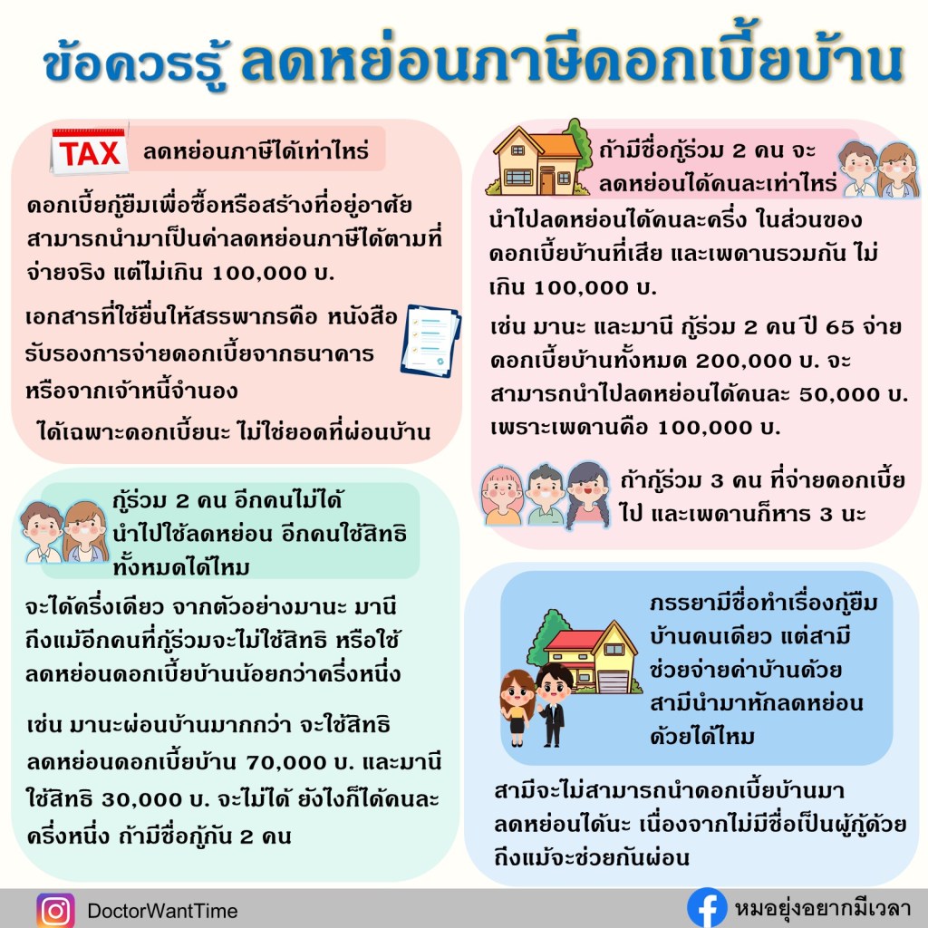 เช่น มานะ และมานี กู้ร่วม 2 คน ปี 65 จ่ายดอกเบี้ยบ้านทั้งหมด 200,000 บ. จะสามารถนำไปลดหย่อนได้คนละ 50,000 บ. เพราะเพดานคือ 100,000 บ.