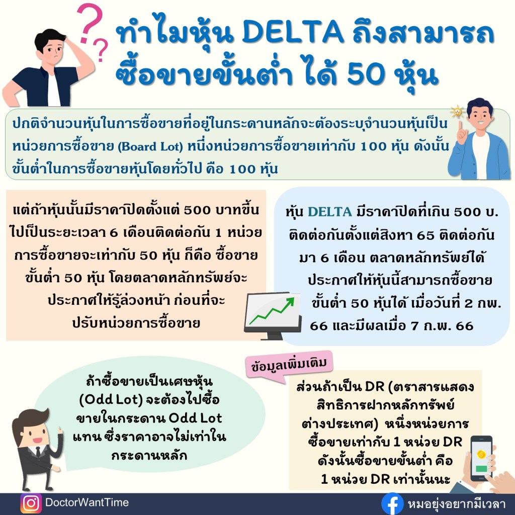 หุ้น DELTA มีราคาปิดที่เกิน 500 บ. ติดต่อกันตั้งแต่สิงหา 65 ติดต่อกันมา 6 เดือน ตลาดหลักทรัพย์ได้ประกาศให้หุ้นนี้สามารถซื้อขาย ขั้นต่ำ 50 หุ้นได้ เมื่อวันที่ 2 กพ. 66 และมีผลเมื่อ 7 ก.พ. 66