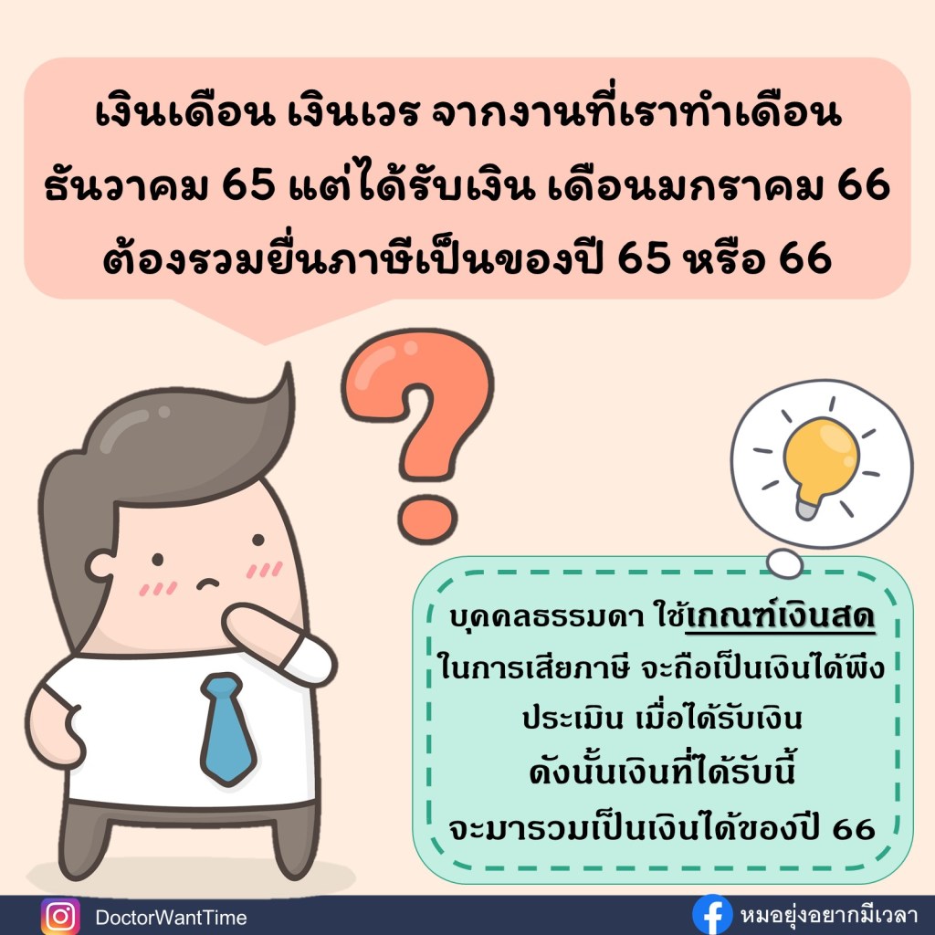 จากตัวอย่าง เงินได้นี้ถึงจะเกิดจากงานที่ทำเมื่อธันวาคม 65 แต่ได้รับเงินเมื่อเดือนมกราคม 66 ดังนั้นถือเป็นเงินได้ของปี 66
