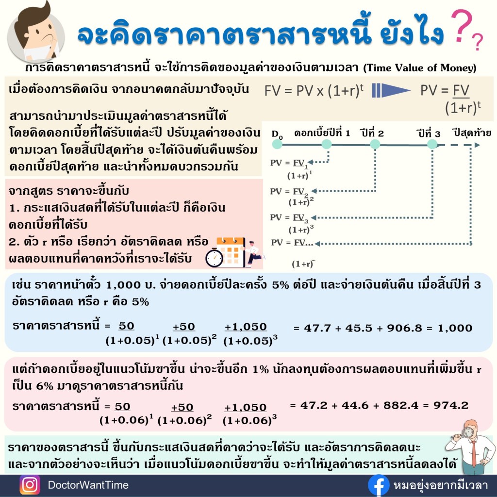 การคำนวณราคาตราสารหนี้ จะใช้เรื่องของมูลค่าของเงินตามเวลา ที่เรารู้จักกันดี