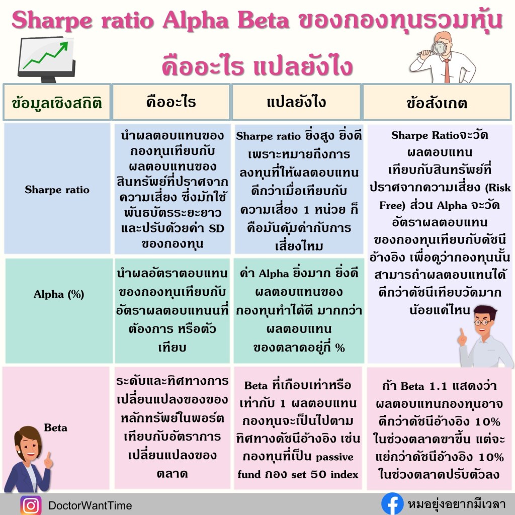 Sharpe Ratio จะวัดผลตอบแทน เทียบกับสินทรัพย์ที่ปราศจากความเสี่ยง (Risk Free) ส่วน Alpha จะวัดอัตราผลตอบแทนของกองทุนเทียบกับดัชนีอ้างอิง เพื่อดูว่ากองทุนนั้นสามารถำผลตอบแทนได้ดีกว่าดัชนีเทียบวัดมากน้อยแค่ไหน