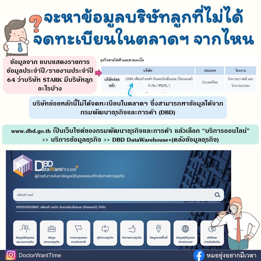 ตัวอย่างที่แสดงให้ดูเป็นบริษัท STARK ที่ไม่นำส่งงบ และถูกขึ้นเครื่องหมาย SP (suspension) ห้ามซื้อขาย และจะมีการเปิดให้ซื้อขายได้ชั่วคราว วันที่ 1-30 มิ.ย. นี้ ที่มีบริษัทลูกหลัก (บริษัทย่อยหลัก) คือ บริษัท เฟ้ลปส์ ดอด์จ อินเตอร์เนชั่นแนล (ไทยแลนด์) จำกัด ที่ไม่ได้จดทะเบียนในตลาดฯ แล้วเราอยากดูข้อมูลบริษัทนี้ เราเป็นบริษัทอะไรยังไง กรรมการเป็นใครบ้าง งบการเงินเป็นยังไง ได้จากตรงนี้