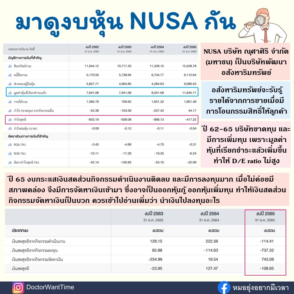 ถ้าดูงบกระแสเงินสด จะเห็นว่าในปี 66 เงินสดส่วนกิจกรรมดำเนินงานติดลบ และมีการลงทุนมากกว่าปกติในส่วนกิจกรรมลงทุน และเมื่อขาดทุนไม่มีเงินสด ก็ต้องจัดหาเงินเข้ามาซึ่งทำได้โดยการกู้ยืมจากสถาบันการเงิน ออกหุ้นกู้ หรือออกหุ้นเพิ่มทุน เข้ามา ทำให้ส่วนเงินสดจากกิจกรรมจัดหาเงินเป็นบวก