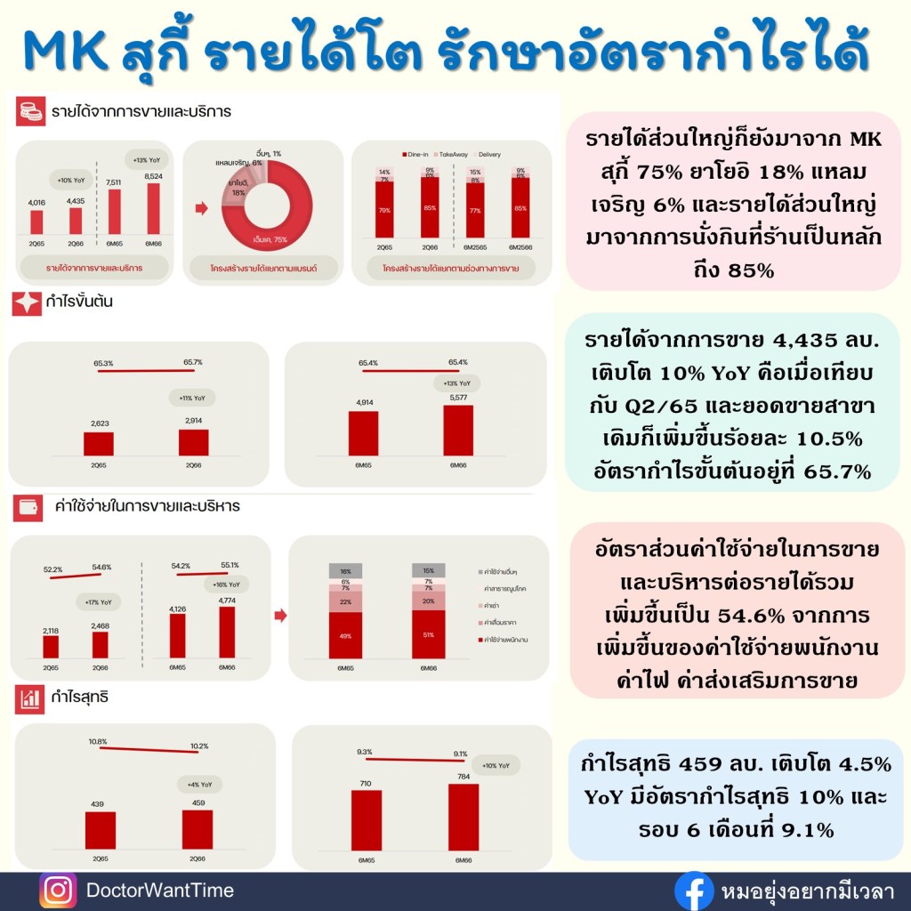 ถ้าเราเข้าร้าน MK สุกี้ เงิน 100 บ. เราจ่ายค่าวัตถุดิบประมาณ 35 บ. ค่าพนักงาน ค่าเช่า ค่าไฟ ประมาณ 55 บ. ดอกเบี้ยและภาษี 1 บ. ร้านมีกำไรประมาณ 9 บ.