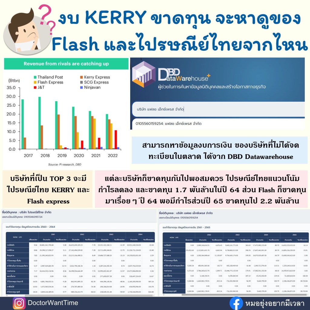 เมื่อเลือกงบกำไรขาดทุน และลองดูของ ไปรษณีย์ไทย และ Flash express จะเห็นว่าแต่ละบริษัทก็ขาดทุนกันไปพอสมควร ของไปรษณีย์ไทย แนวนโน้มกำไรลดลง และขาดทุน 1.7 พันล้านในปี 64 ส่วน Flash ก็ขาดทุนมาเรื่อย ๆ ปี 64 พอมีกำไรส่วนปี 65 ขาดทุนไป 2.2 พันล้าน