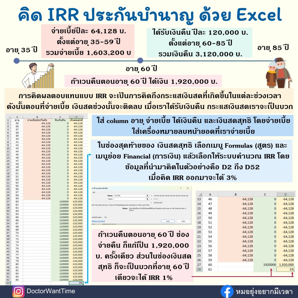เราสามารถคิดผลตอบแทนแบบ IRR ของประกันบำนาญได้ด้วยตัวเอง โดยใช้โปรแกรม excel มาลองดูกัน
