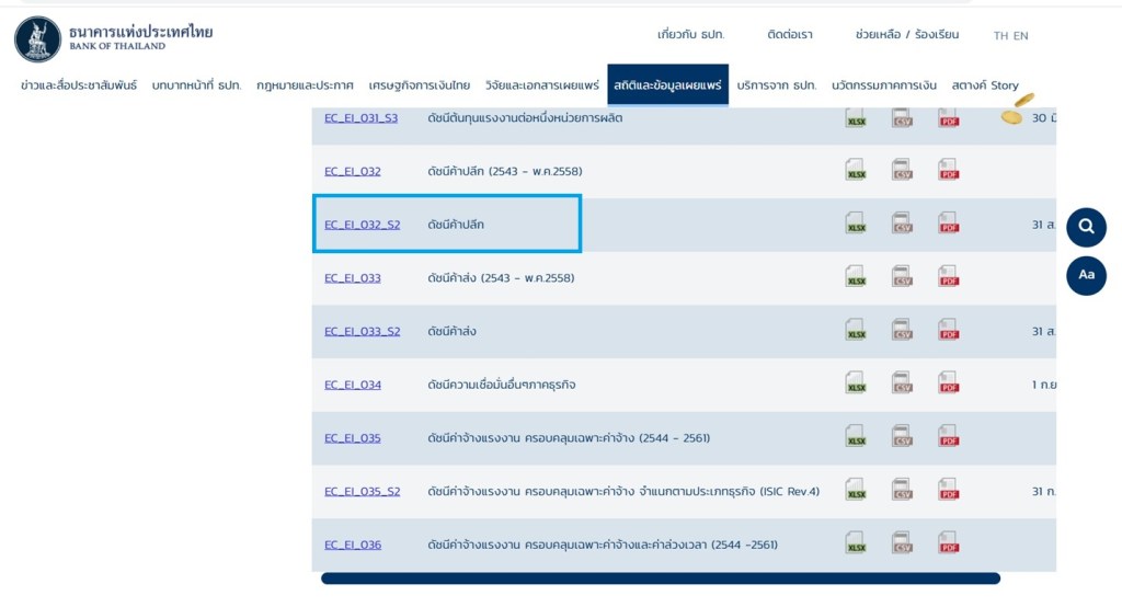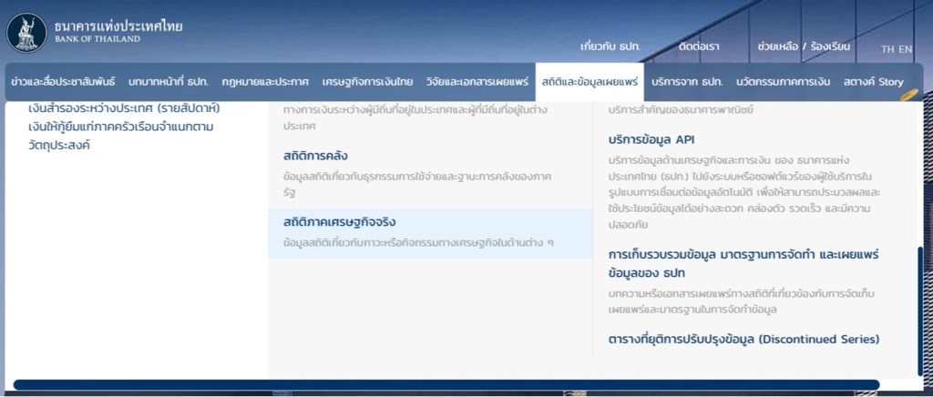 เริ่มจากเข้าไปในเว็บไซต์ของธนาคารแห่งประเทศไทย (BOT) เลือก “สถิติและข้อมูลเผยแพร่” >> “สถิติภาคเศรษฐกิจจริง”