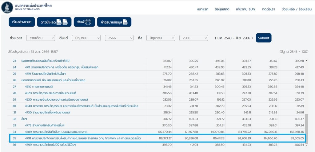 เมื่อเราอ่านบทวิเคราะห์งบของฝ่ายจัดการของบริษัท Kerry ชื่อย่อหุ้น KEX จะพูดถึง “สถิติด้านเศรษฐกิจจากธนาคารแห่งประเทศไทย ดัชนียอดค้าปลีกในหมวดการขายสินค้าผ่านทางไปรษณีย์ (Mail order) และอินเทอร์เน็ต” ซึ่งเป็นภาพรวมของประเทศที่ส่งผลต่อรายได้ของบริษัทได้ ซึ่งเราสามารถเข้าไปหาสถิตินี้ได้