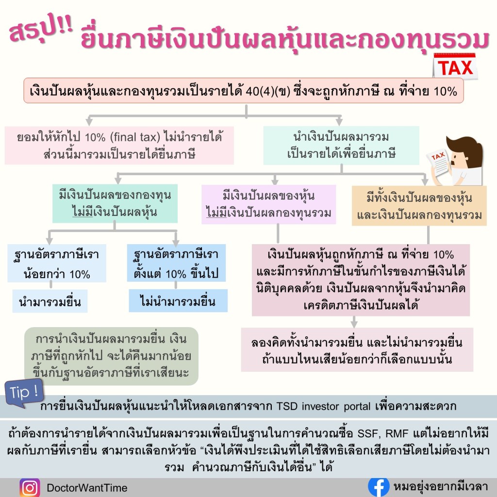 ถ้ามีเฉพาะเงินปันผลของกองทุนรวม ให้ดูฐานอัตราภาษีของเราที่เสีย ถ้าเสียฐานอัตราภาษีที่ตั้งแต่ 10% ขึ้นไปอยู่แล้ว ไม่ควรนำมารวมยื่น ถ้าเสียฐาน น้อยกว่า 10% ค่อยนำมารวมยื่น อ่านวิธีการยื่นแบบละเอียดทีละขั้น เข้าไปอ่านได้จาก “How to…ยื่นภาษีเงินปันผลกองทุนรวม” จากลิงค์นี้นะคะ https://doctorwanttime.com/2022/01/17/how-toยื่นภาษีเงินปันผลกอง/
