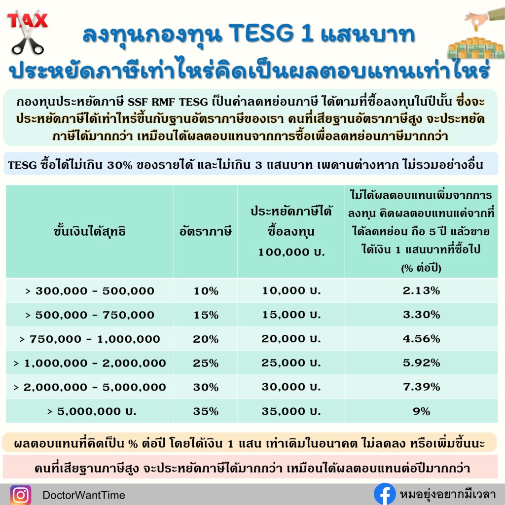 ถ้าลงทุน ThaiESG ที่มีความเสี่ยงต่ำ 1 แสนบาท ถือ 5 ปี เพื่อลดหย่อนภาษี โดยที่ไม่ได้ผลตอบแทนส่วนเพิ่มหรือลดจากการลงทุน จะคิดเป็นผลตอบแทนเท่าไหร่ต่อปี ลองมาคิดกัน ![]()