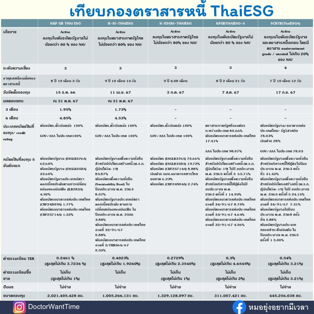 กอง TESG ที่เป็นกองตราสารหนี้ส่วนใหญ่เพิ่งเปิดกอง ที่เปิดมาพอมีผลการดำเนินงานแสดงจะมี KKP GB THAI ESG, B-SI-THAIESG จะลองทำตารางเทียบ 5 กองให้ดูนะ KKP GB THAI ESG, B-SI-THAIESG, K-ESGSI-THAIESG, KFGBTHAIESG-A, SCBTB (ThaiESGA)