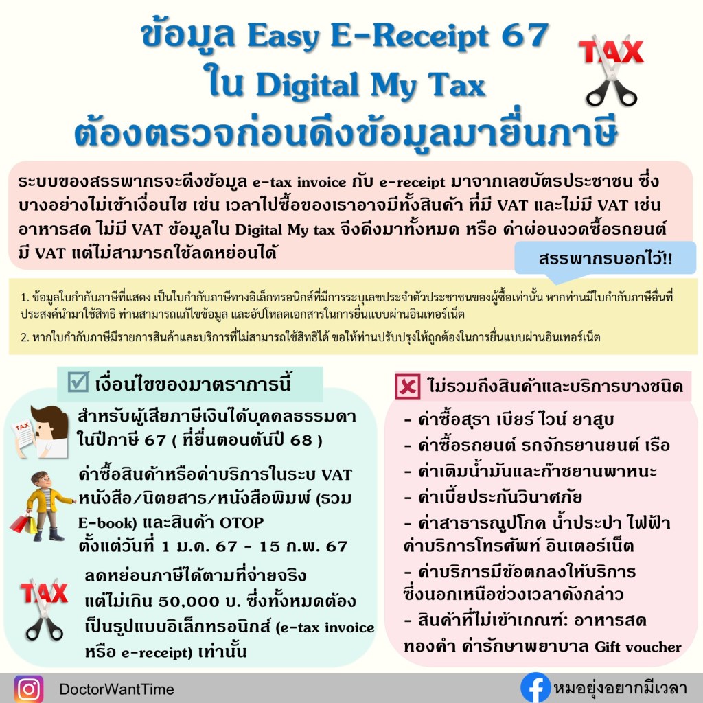 – Easy-e-receipt 67 ก็จะมาแสดงในนี้ ตอนนี้มีข้อมูลแสดงแล้ว ลองตรวจสอบรายละเอียดกับเอกสารหลักฐานที่เรามีด้วยนะ เผื่อสรรพากรของเอกสารหลักฐาน และตรวจสอบข้อมูลก่อนด้วยนะ เพราะบางอย่างใช้ลดหย่อนไม่ได้ ระบบของสรรพากรจะดึงข้อมูล e-tax invoice กับ e-receipt มาจากเลขบัตรประชาชน ซึ่งบางอย่างไม่เข้าเงื่อนไข เช่น เวลาไปซื้อของเราอาจมีทั้งสินค้า ที่มี VAT และไม่มี VAT เช่น อาหารสด ไม่มี VAT ข้อมูลใน Digital My tax จึงดึงมาทั้งหมดที่เป็น e-tax invoice หรือ ค่าผ่อนงวดซื้อรถยนต์ มี VAT แต่ไม่สามารถใช้ลดหย่อนได้