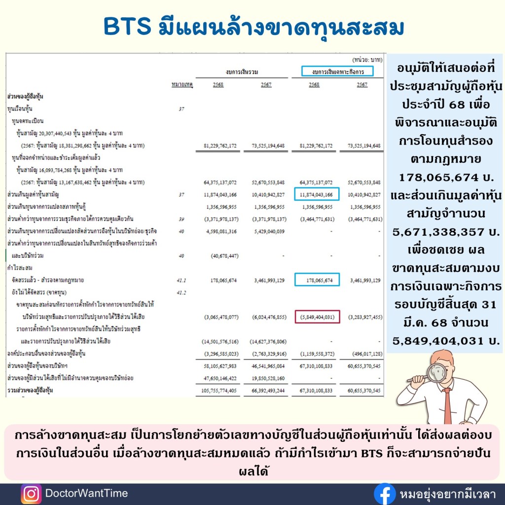 BTS จึงมีมติกรรมการ และรอเข้าที่ประชุมผู้ถือหุ้น ในการล้างขาดทุนสะสมในงบเฉพาะกิจการที่ 5,728,180,124 บ. โดยใช้ ทุนสำรองตามกฎหมาย จำนวน 178,065,674 บ. ส่วนเกินมูลค่าหุ้นสามัญ จำนวน 5,671,338,357 บ. เพื่อชดเชย ขาดทุนสะสม 5,849,404,031 บ.